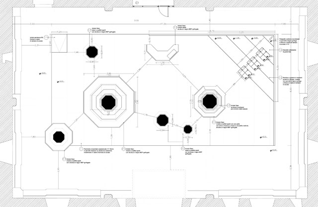 Il progetto si inserisce nell’ambito del più ampio programma di riqualificazione del percorso museale di Palazzo Vecchio e ha come oggetto l’allestimento e l’adeguamento funzionale della Sala d’Arme situata al piano terreno del Palazzo.I molteplici obiettivi del progetto: riunire le nuove funzioni previste all’interno di un unico intervento unitario e riconoscibile, mantenere la spaziosità della Sala, garantire la fluidità e la separazione dei flussi e delle attività dei visitatori, garantire il rispetto della struttura esistente, si traducono in una soluzione progettuale unitaria: la creazione di una sorta di “tappeto” connotato per materiale e forma e posizionato nel centro della sala, che riunisce al suo interno, senza introdurre elementi verticali di forte separazione, i diversi arredi destinati alle nuove funzioni: gli scaffali per il bookshop, lo spazio per la cassa, le sedute destinate alle conferenze, ecc. Il tappeto garantisce così la separazione dei flussi principali diretti alle sale del Museo dai flussi di visitatori diretti allo spazio di distribuzione audio guide e alla futura biglietteria presente nella Sala d’Arme e dai flussi di visitatori in uscita diretti agli scaffali del bookshop. La presenza della gradinata, sempre accessibile anche quando non sono previste conferenze, garantisce uno spazio “aperto” destinato ai visitatori in sosta.