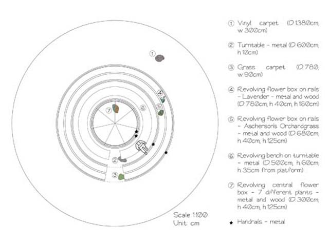 Merry go round-garden is not only a garden that, in less than 50 square meters, gives you the complete experience of a garden (colours, fragrances, sounds) but, above all, it’s a carousel: four concentric rings (three with flowers and plants and one as a bench) that turn with the traditional merry-go-round mechanical device.