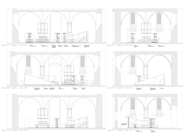 Il progetto si inserisce nell’ambito del più ampio programma di riqualificazione del percorso museale di Palazzo Vecchio e ha come oggetto l’allestimento e l’adeguamento funzionale della Sala d’Arme situata al piano terreno del Palazzo.I molteplici obiettivi del progetto: riunire le nuove funzioni previste all’interno di un unico intervento unitario e riconoscibile, mantenere la spaziosità della Sala, garantire la fluidità e la separazione dei flussi e delle attività dei visitatori, garantire il rispetto della struttura esistente, si traducono in una soluzione progettuale unitaria: la creazione di una sorta di “tappeto” connotato per materiale e forma e posizionato nel centro della sala, che riunisce al suo interno, senza introdurre elementi verticali di forte separazione, i diversi arredi destinati alle nuove funzioni: gli scaffali per il bookshop, lo spazio per la cassa, le sedute destinate alle conferenze, ecc. Il tappeto garantisce così la separazione dei flussi principali diretti alle sale del Museo dai flussi di visitatori diretti allo spazio di distribuzione audio guide e alla futura biglietteria presente nella Sala d’Arme e dai flussi di visitatori in uscita diretti agli scaffali del bookshop. La presenza della gradinata, sempre accessibile anche quando non sono previste conferenze, garantisce uno spazio “aperto” destinato ai visitatori in sosta.